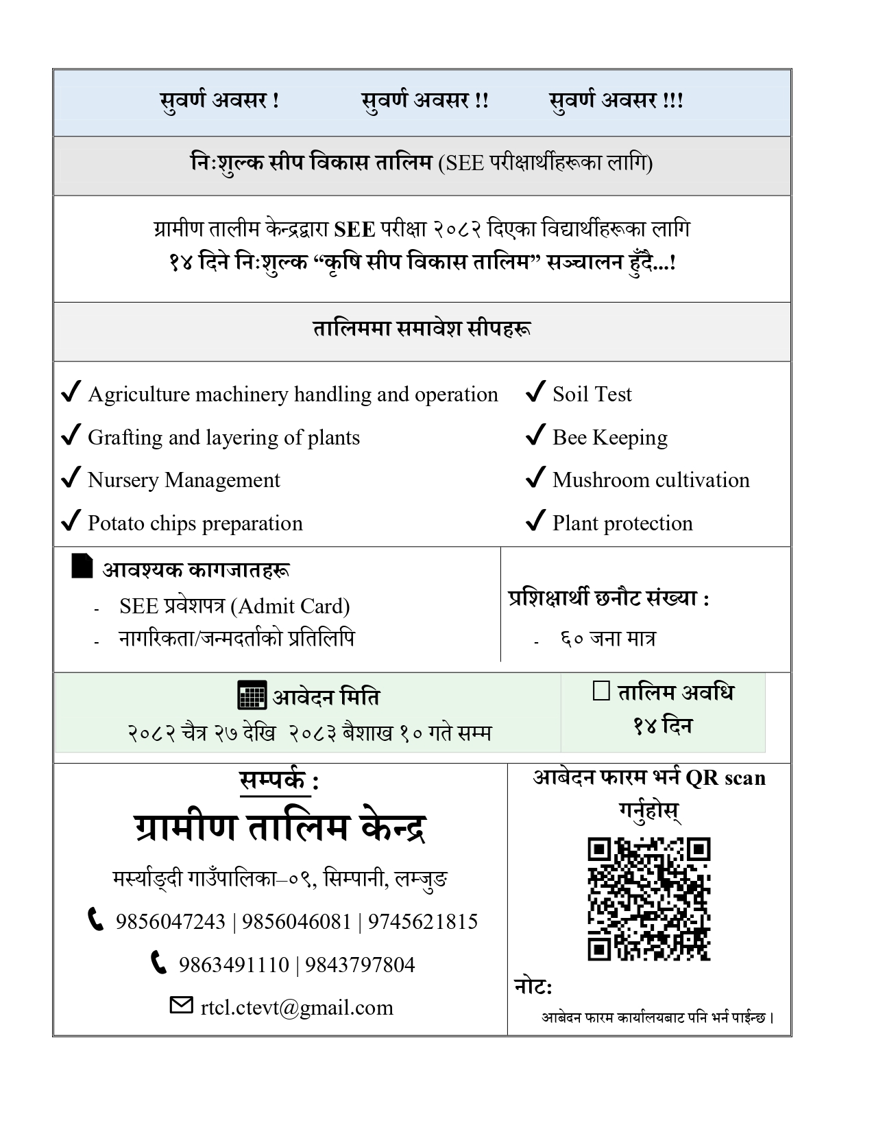 SEE परीक्षा २०८२ दिएका विद्यार्थीहरूका लागि १४ दिने निःशुल्क सीप विकास तालिम